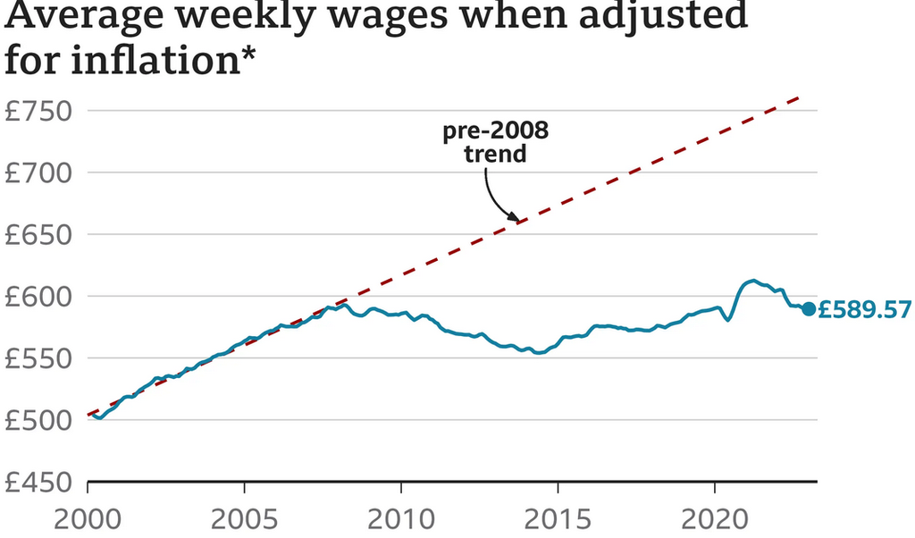 Si les salaires britanniques avaient suivi la tendance pre-2008, les Anglais auraient 11 000£ de plus par an.