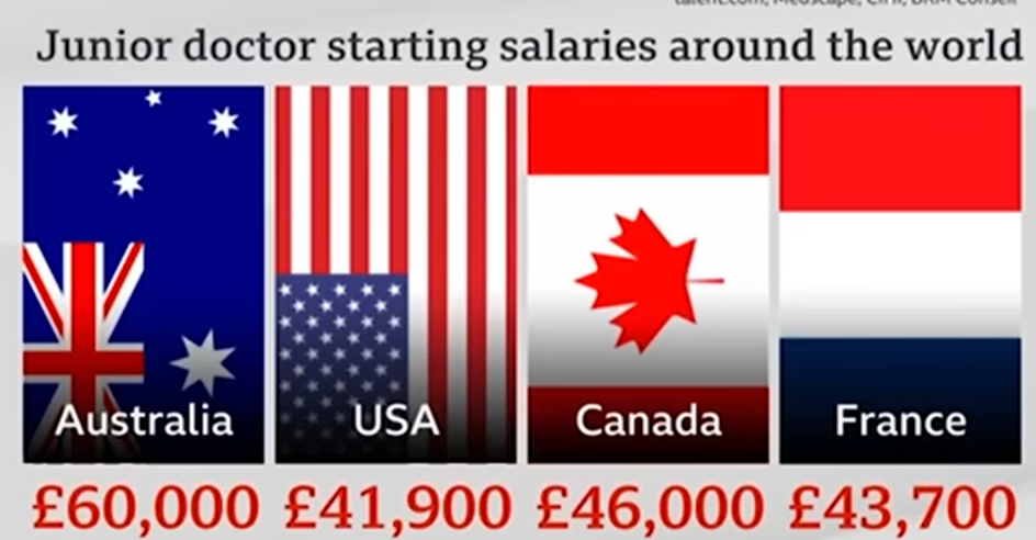 Mais ce n'est pas tout. Les salaires pour les médecins débutants sont inférieurs en Angleterre qu'en France. Et ce n'est pas une petite différence :