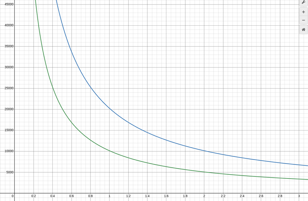 Donc ce qui nous intéresse c'est toutes les paires de points qui ont la même valeur sur l'axe y. On peut voir que la vitesse de pilonnage dépend linéairement de la taille du pénis, il faut que la bite de 10 cm ait une vitesse de pilonnage de deux fois la vitesse de la bite de 20 cm.