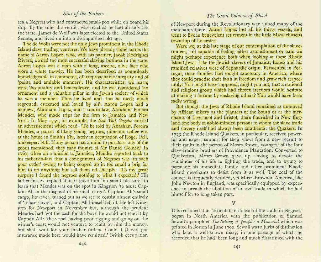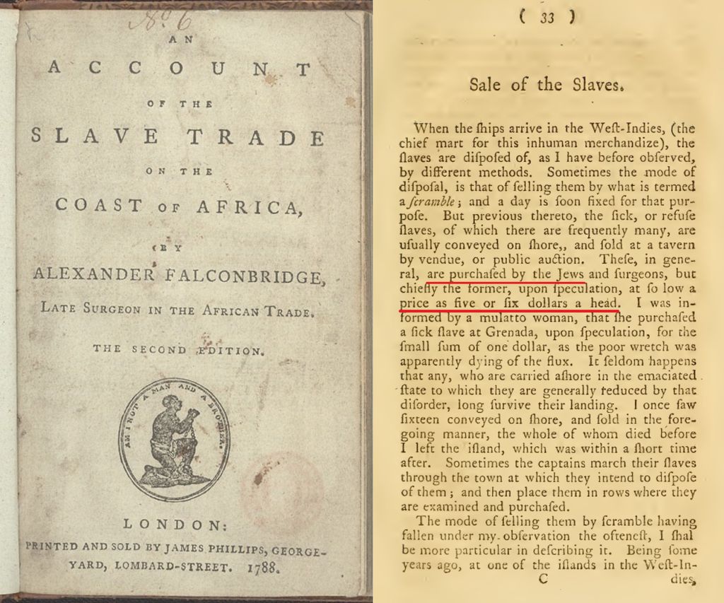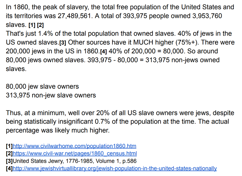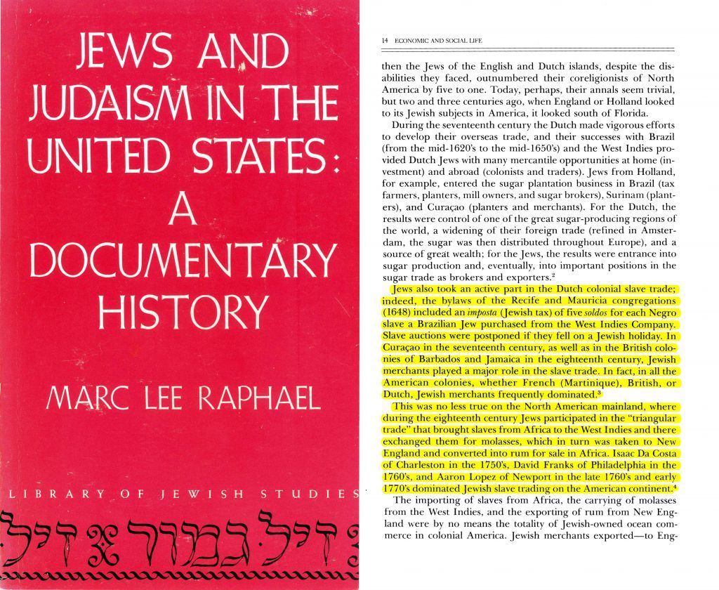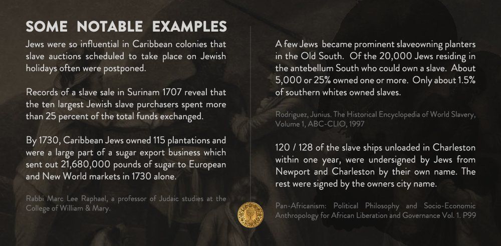 D’après la source précédente, au minimum, bien plus de 20 % de tous les propriétaires d’esclaves américains étaient juifs, alors qu’ils représentaient 0,7 % de la population à l’époque.