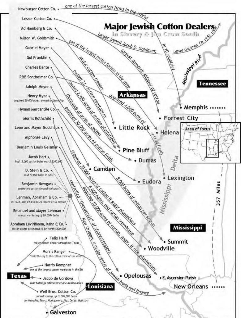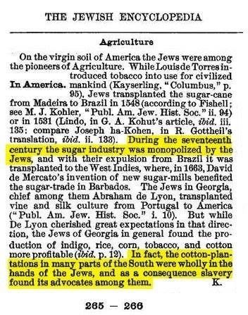 Même l'Encyclopédie juive reconnaît qu'au cours du XVIIe siècle, l'industrie sucrière était monopolisée par les Juifs et que les plantations de coton dans de nombreuses régions du Sud étaient entièrement aux mains des Juifs.