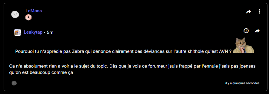 En tout cas, tous les modos ou forumeurs qui se respectent, car je sais que ça vient de temps en temps, vous serez les bienvenus ici et vous aurez plus de personnes pour échanger que de voir une page sur 30 min avec des topics aw, il n'est jamais trop tard sauf pour les déviants et ceux qui les protègent.