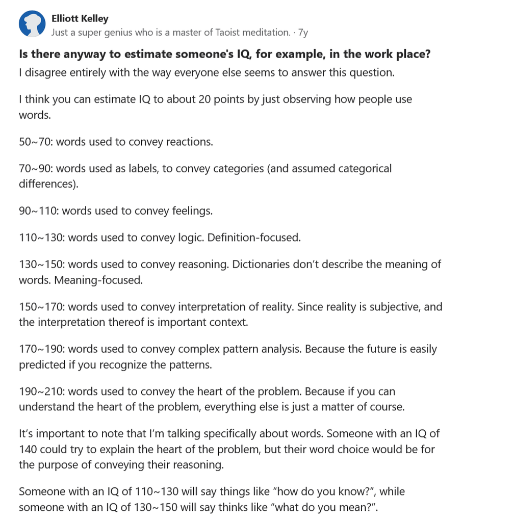 Si tu y arrives ainsi tu dois avoir un certain talent. Ça me rappelle quelqu'un sur Quora qui disait avoir développé une méthode pour estimer la tranche de QI des gens à partir de l'usage qu'ils font des mots.