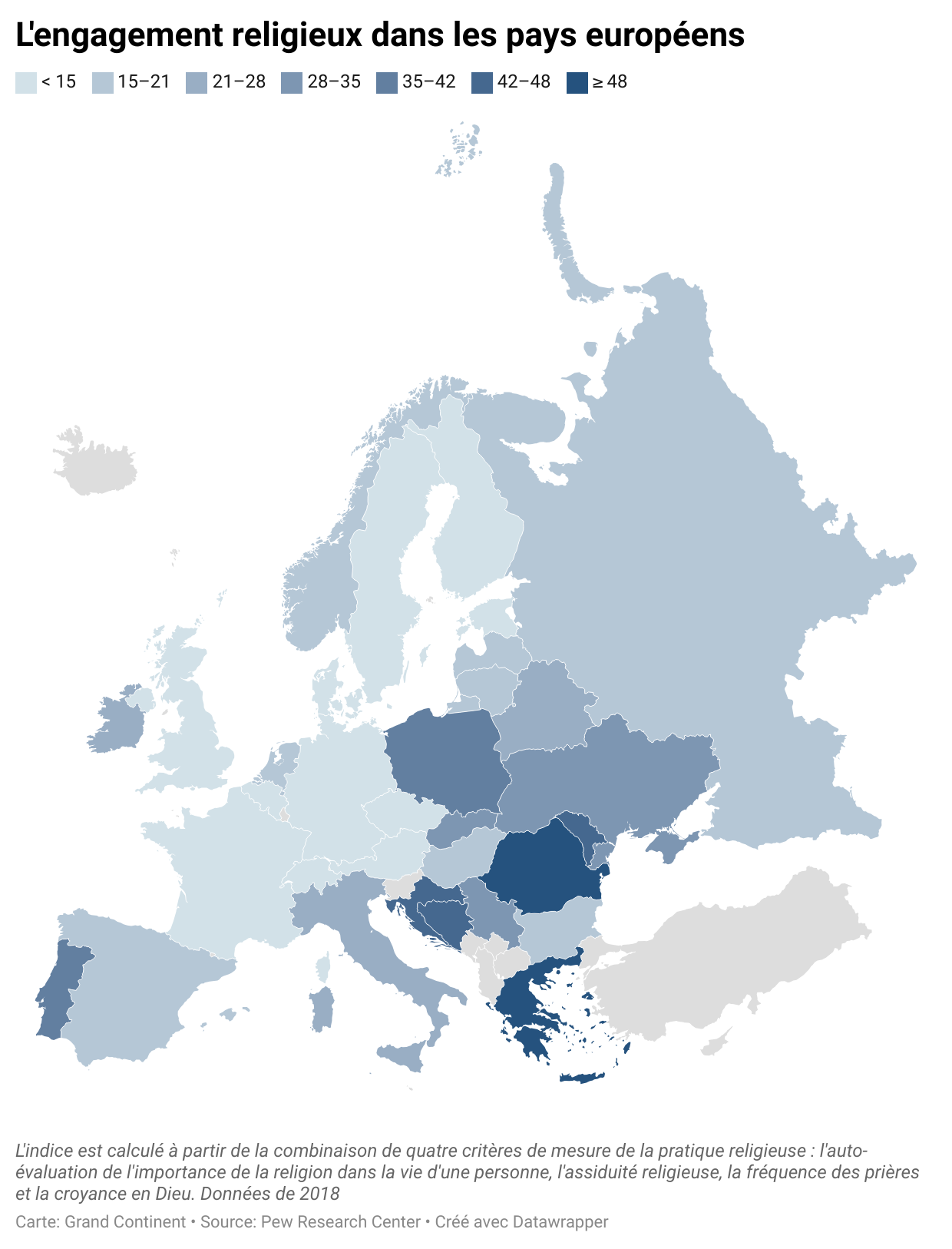 Voila la carte des croyants pratiquants (bleu clair = non pratiquant, bleu foncé = très pratiquants).