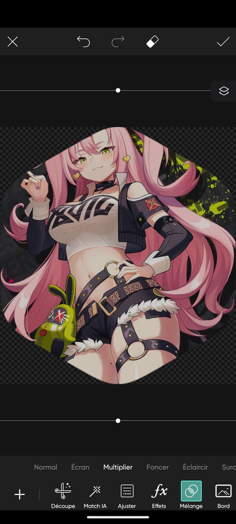 Tu télécharges le patron du badge, tu mets ton image par dessus et dans le panel de modifications tu vas sur la section "mélange" puis "multiplier"