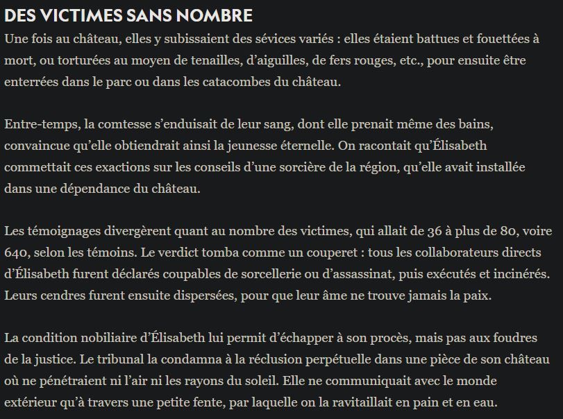 Tu dois faire allusion à Élisabeth Báthory, la comtesse sanglante qui se baignait dans du sang de vierge.