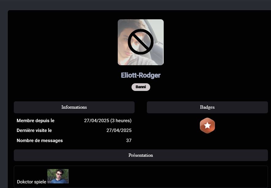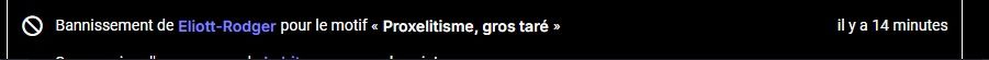 Bannissement de Eliott-Rodger pour le motif « Proxelitisme, gros taré »