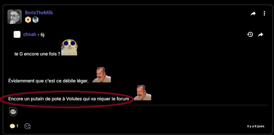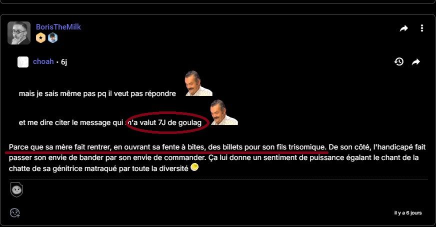 Il croit qu'on ne sait pas pourquoi il agit ainsi, il est juste en rage depuis le topic où ça voulait se moquer de mon goulag d'un jour où j'avais juste signalé Boris qui passait son temps à insulter les agriculteurs avec l'autre zouave en leur souhaitant de crever comme Thomas de Crépol et qui a aussi d'ailleurs avoué au goulag qu'il avait menacé de viol quelqu'un, et au final, Porsenna s'est fait goulag peu après que je sors du goulag, il a eu avec avertissement ban déf.