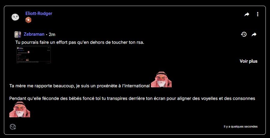 Le cas Eliott-Rodger sous multi, un type qui vous insulte votre mère, vous parle de proxénétisme et d'actes sexuels sur des bébés puis supprime son message pour dire qu'on diffame en rappelant juste la loi dans votre pays.
