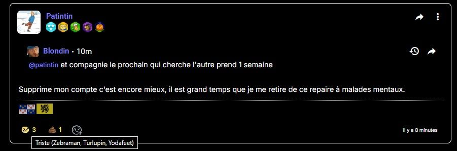 Rappel quotidien que Patintin diffame quand il perd un débat et dit que les gens qui lui donnent tort sont mes secondaires, chiale plus fort :