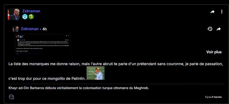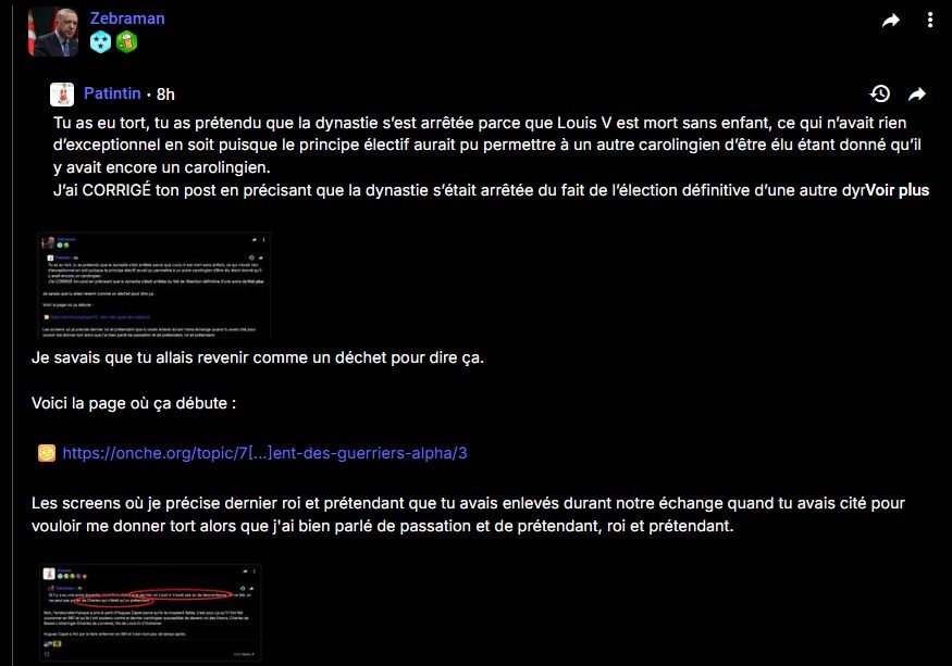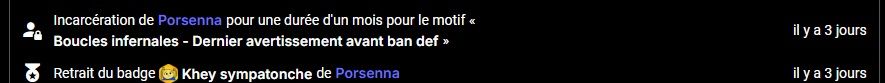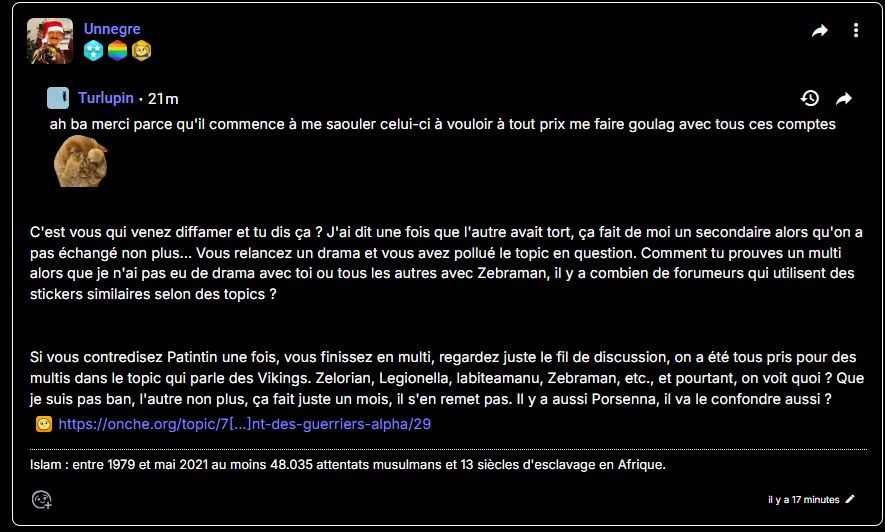 Porsenna a eu cet avertissement en prenant un mois, donc techniquement si j'avais tort, ça se saurait, l'autre rat de Turlupin utilise le vocalubaire similaire en se pensant malin, il diffame de multis sans nous dire lesquels, il me parle d'un compte youtube au départ, c'est quoi le rapport entre multis de forum et youtube, pauvre singe, et je n'ai pas fait ce qu'il a fait, sur 3 heures, son objectif, c'était de diffamer et faire ses patterns et il a avoué...