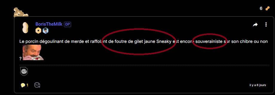 La fois où j'avais défendu des agriculteurs sur un topic, Juliette avait parlé des problèmes socio-économiques et Boris qui est une racaille anti blanc derrière le pseudo, son but était juste de dénigrer les agriculteurs alors qu'ils bossent l'année pour vous, un type toxique d'avn qui est anti blanc, je faisais donc le débat pour lui rappeler qu'un agriculteur a de la valeur et il avait avoué ne servir à rien pour la France mais que les agriculteurs n'ont pas de couille alors qu'en réalité, il s'agissait de comprendre que les médias + gouvernement + les racailles pouvant tuer de sa famille sans solidarité de la police, c'est un peu beaucoup de vomir sur plusieurs pages sur les agriculteurs en France, je le signale, je prends un jour avec cette merde et devinez quoi ?
