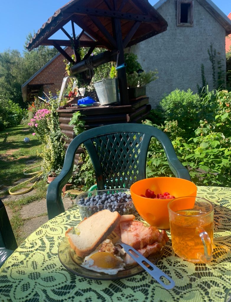 donc aujourd’hui, séance vélo et go vers les lacs, le plus proche est à une vingtaine de km donc petit dej avec des trucs du coin (œufs et lard fumé des voisins)
