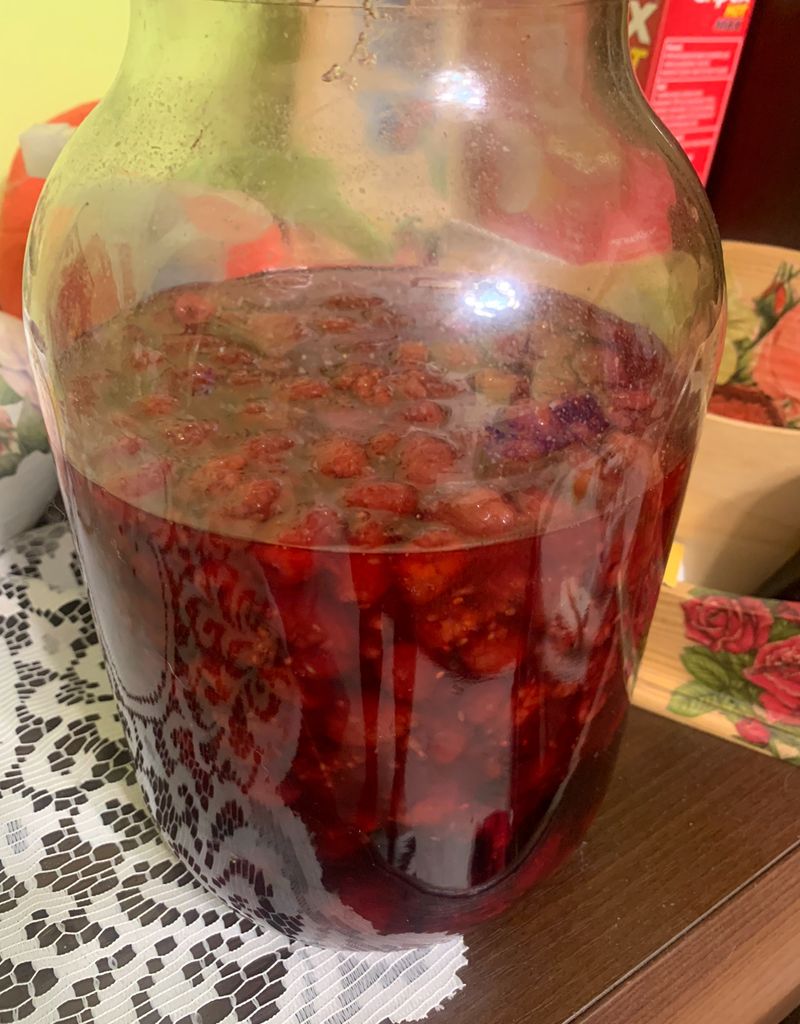 Mise en bocal, quand tout les fruits seront en bas, on filtre et c’ est bon, liqueur framboise maison (framboises du jardin, vodka, Spiritus, sucre et du temps)