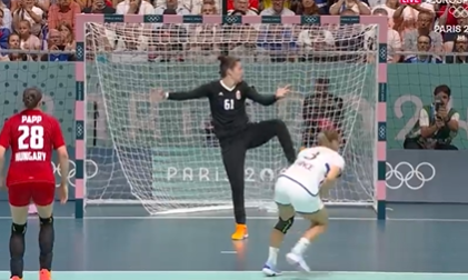 Kuczora tire victorieusement côté droit sur ce jet de 7 mètres obtenu par les Hongroises. Elle prend le meilleur sur Sako et remet sa partie à une longueu (20-21).