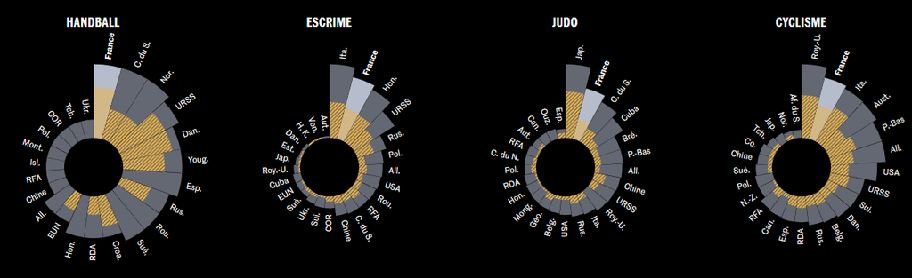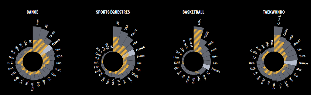 Survolez chaque graphique pour voir combien de médailles ont été remportées par délégation, depuis 1948. Seules les 25 premières délégations qui ont remporté le plus de médailles sont affichées.