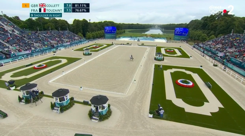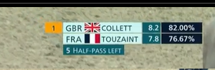 La Britannique Laura Collett prend la tête ! Après un passage superbe, la Britannique Laura Collett, sur London 52, a assommé l'épreuve de dressage du concours complet. Elle n'a récolté que 17.50 points de pénalité. Ce qui la place largement en tête devant un autre Britannique, Tom McEwen (25.80 points).