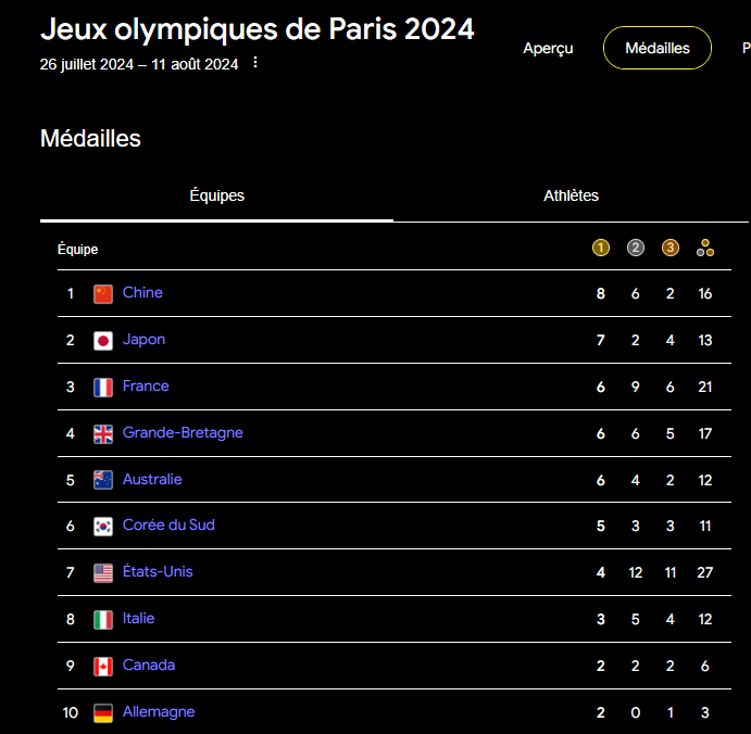 Le souci, c'est qu'on se moque d'eux, mais comme ils ont le plus de médailles en argent, si on fait égalité, ils sont devant en médaille or, voilà pourquoi la France est refaite en hauteur si ça égalise juste avec les autres.