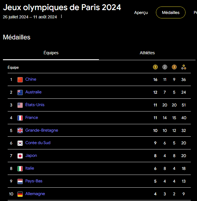 En terme de médailles d'or, la Chine devant, il va falloir trouver plus de médailles.