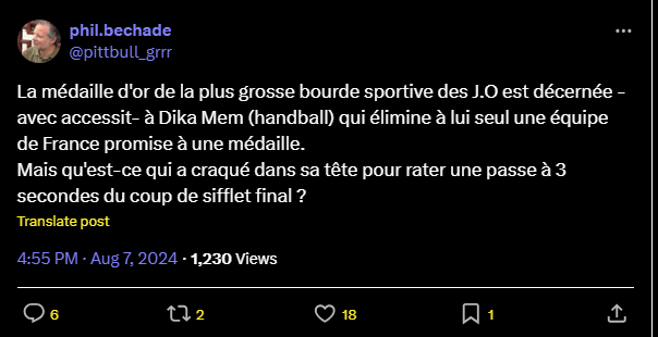 La médaille d'or de la plus grosse bourde sportive des J.O est décernée -avec accessit- à Dika Mem (handball) qui élimine à lui seul une équipe de France promise à une médaille.