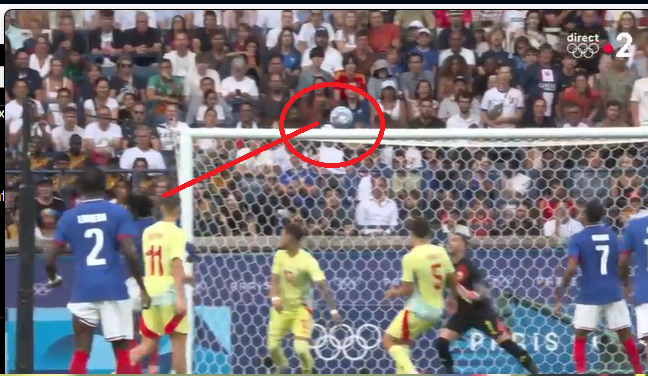 Le nègre Badé stoppe irrégulièrement Oroz pour l'empêcher de jouer le une-deux avec Baena. C'était dans le dos de l'arbitre qui met du temps à en être informé et à siffler faute.