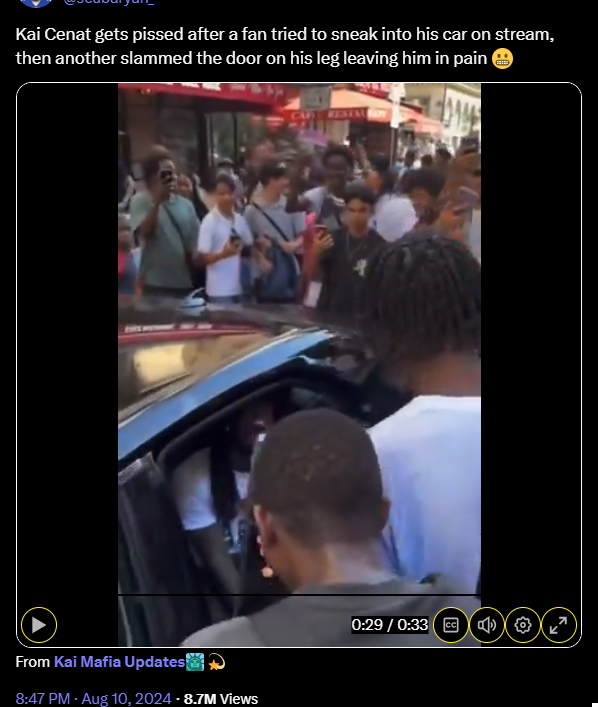 Kai Cenat est énervé après qu'un fan ait tenté de se faufiler dans sa voiture en direct, puis un renoi obèse lui a claqué la portière sur la jambe, le laissant souffrir.