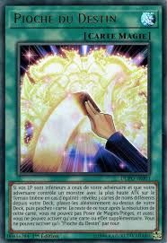 Si vos LP sont inférieurs à ceux de votre adversaire et que votre adversaire contrôle un monstre avec la plus haute ATK sur le Terrain (même en cas d'égalité) : révélez 3 cartes de noms différents depuis votre Deck, placez-les aléatoirement au-dessus de votre Deck, puis piochez 1 carte. Le reste de ce tour après la résolution de cette carte, vous ne pouvez pas Poser de Magies/Pièges, et aussi, vous ne pouvez activer qu'une carte ou effet supplémentaire. Vous ne pouvez activer qu'1 "Pioche du Destin" par tour.