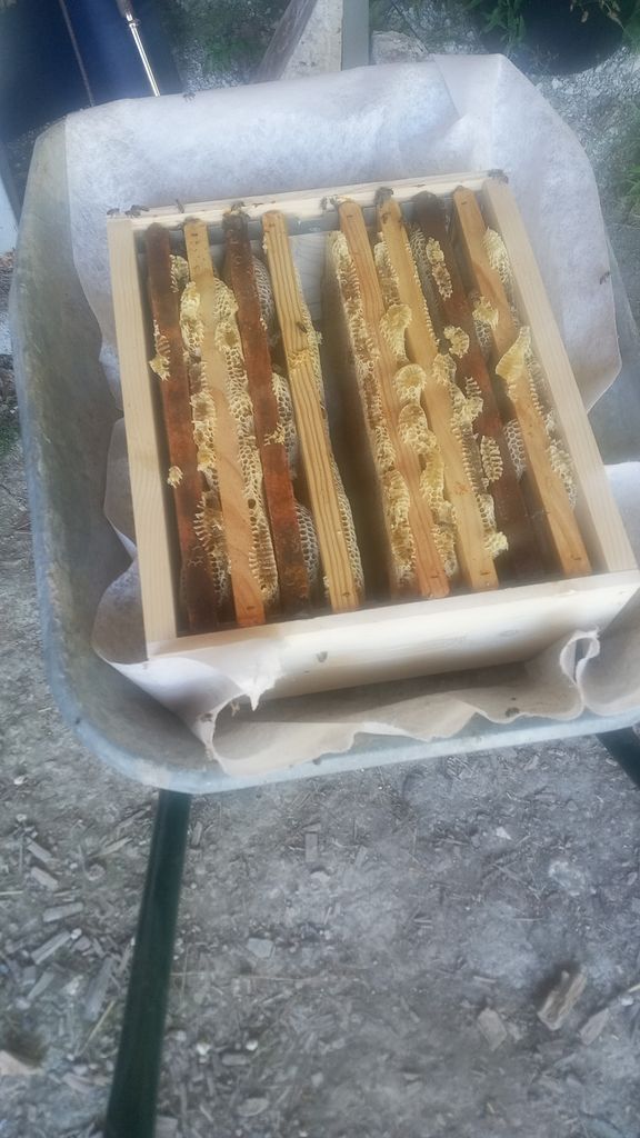 Les cadres sont pas construits droits du coup difficile de bien chasser toutes les abeilles. J'ai l'espoir qu'elles retourneront dans leur ruche dans la soirée.