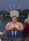 - Le réenactement de la cène avec un diable/dieu païen à poil qui s'inscruste pour trôner au milieu de la cène, la grosse au milieu à la place de Christ a une coiffure parodiant une monstrance/ostensoire.