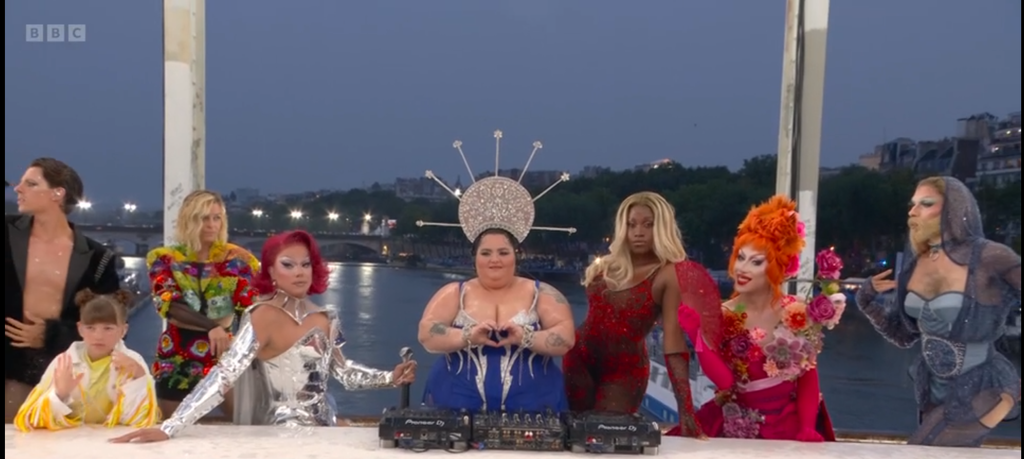 - Le réenactement de la cène avec un diable/dieu païen à poil qui s'inscruste pour trôner au milieu de la cène, la grosse au milieu à la place de Christ a une coiffure parodiant une monstrance/ostensoire.