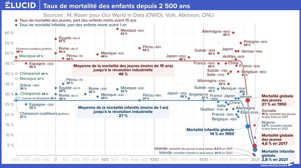 "Historiquement, la mortalité de notre espèce a en effet été très élevée : jusqu’au XVIIIe siècle, 3 enfants sur 10 mourraient avant l’âge de 1 an, et 5 sur 10 avant d’atteindre 15 ans. Ces taux très élevés vers 1700 sont de l’ordre de ceux des populations de chasseurs-cueilleurs de la Préhistoire, voire même de populations de singes : très peu de progrès avaient donc eu lieu sur ce grave problème. En conséquence, la natalité devait être très élevée pour compenser le décès de la moitié des jeunes humains."