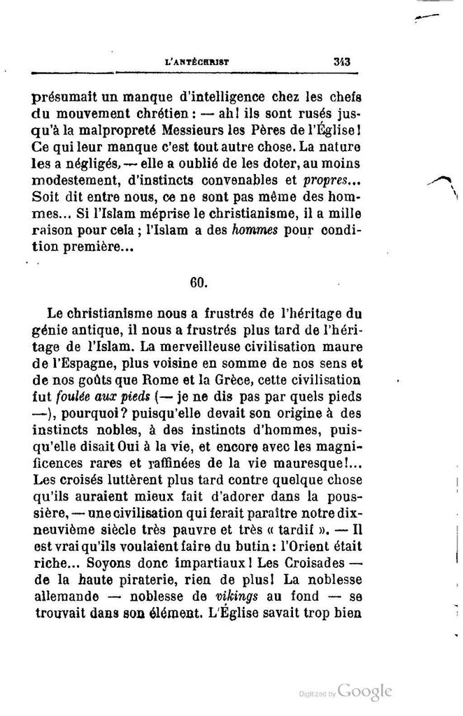 Islam : Le mal existe parce que c'est comme ça, pas de faute primordiale. Dieu annonce un messie pendant quinze siècles pour qu'il ne serve finalement à rien puisqu'il n'y a rien à racheter et, pire, qu'il choisisse des disciplines qui vont travestir la parole divine pour créer la plus grande hérésie de tous les temps. Après quoi viendra finalement le dernier envoyé de Dieu qui, sabre au poing et écume aux lèvres, viendra légaliser le mariage des enfants, le viol des esclaves et le califat perpétuel.