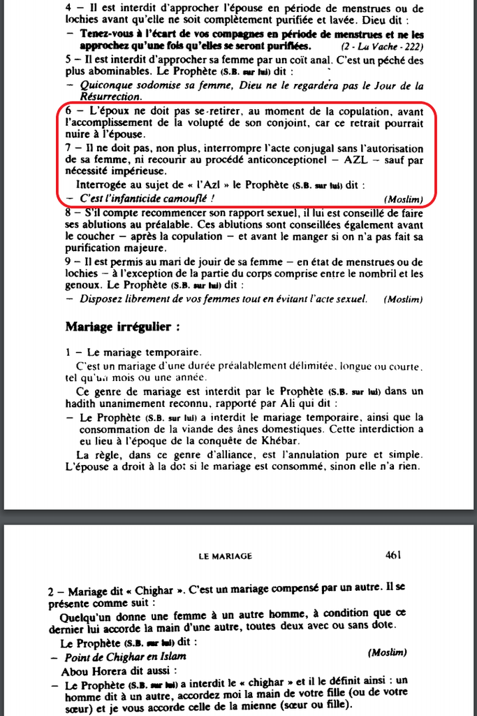 Ainsi marier les très jeunes filles n'est pas une obligation religieuse, l'espérence de vie actuelle permettant tout à fait de retarder un peu l'age du mariage et sa consommation, mais pas trop non plus ... Il faut toujours les marier et les féconder avant la ménopause...Enfin si on ne veut pas que son peuple ne disparraisse en seulement quelques générations