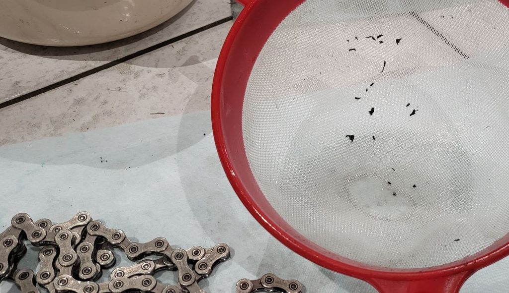 Je mets la chaine dans la passoire, je trempe et secoue dans l'essence.