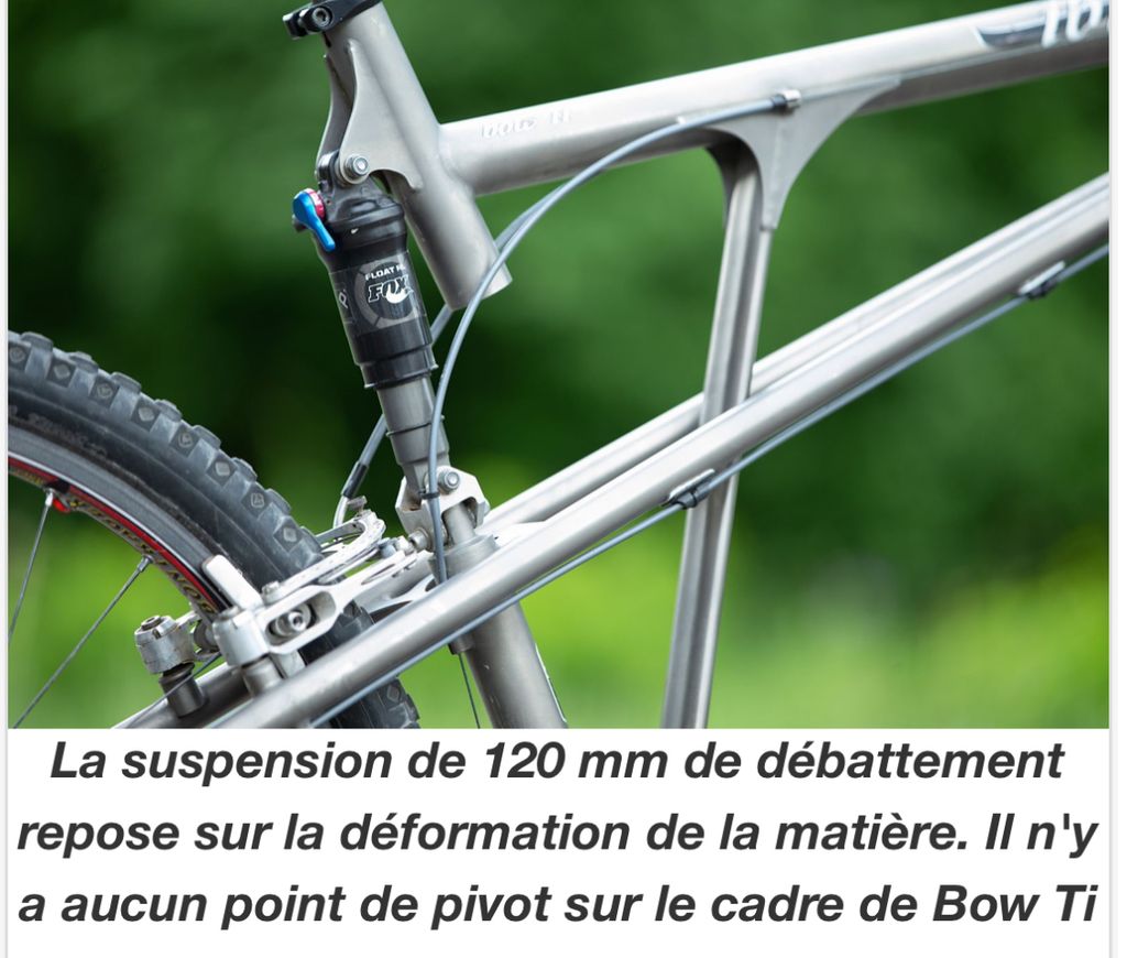 Les premières VTT mythiques full titane des légendaires marques Merlin, Ibis ou Litespeed arrivaient à avoir des débattements jusqu’à 25mm naturellement en intégrant la suspension arrière directement dans le cadre et en jouant uniquement sur la souplesse et le retour de forme du cadre en titane lors des variations de la suspension