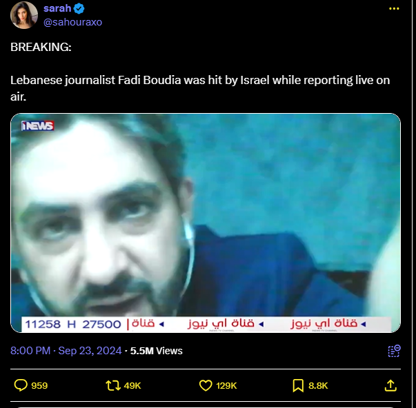 Lebanese journalist Fadi Boudia was hit by Israel while reporting live on air.