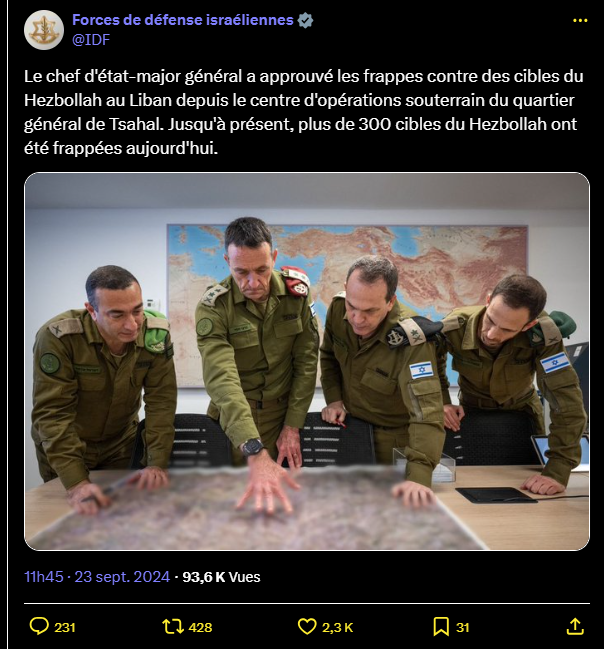 Le chef d'état-major général a approuvé les frappes contre des cibles du Hezbollah au Liban depuis le centre d'opérations souterrain du quartier général de Tsahal. Jusqu'à présent, plus de 300 cibles du Hezbollah ont été frappées aujourd'hui.