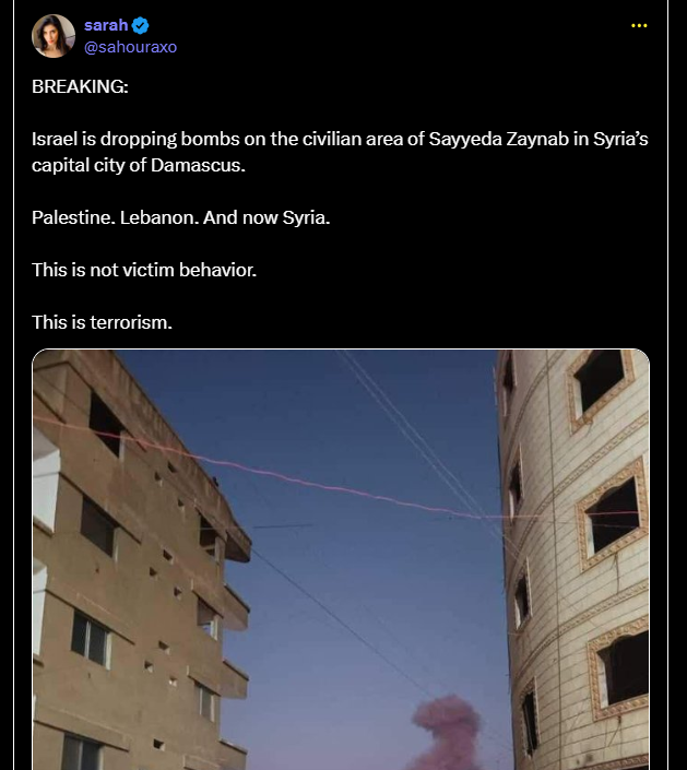 Israel is dropping bombs on the civilian area of Sayyeda Zaynab in Syria’s capital city of Damascus.