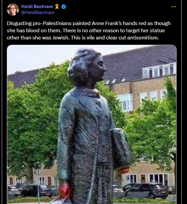 Des pro-palestiniens dégoûtants ont peint les mains d’Anne Frank en rouge comme si elle avait du sang dessus. Il n’y a aucune autre raison de cibler sa statue que le fait qu’elle était juive. C’est un antisémitisme ignoble et clair.