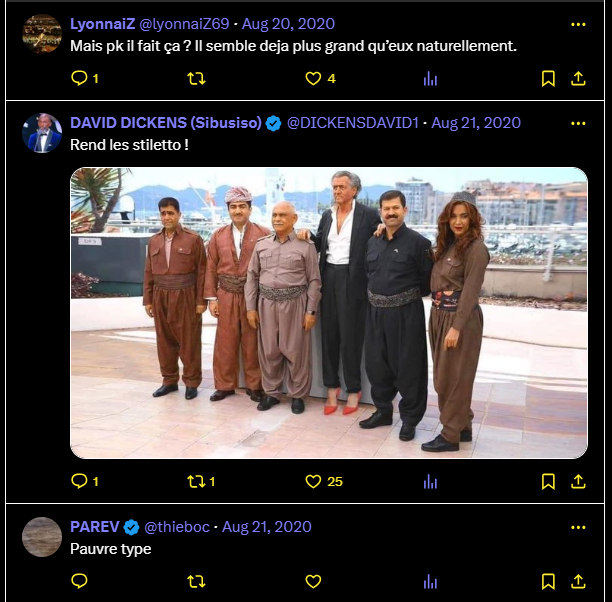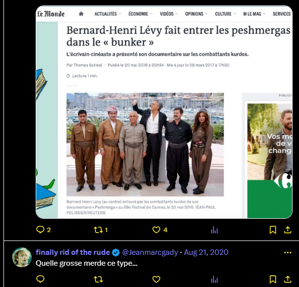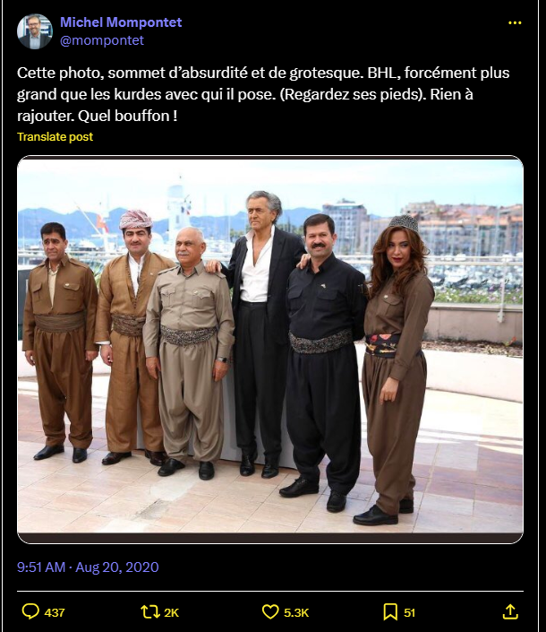 Cette photo, sommet d’absurdité et de grotesque. BHL, forcément plus grand que les kurdes avec qui il pose. (Regardez ses pieds). Rien à rajouter. Quel bouffon !