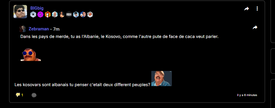 Ce fils de pute vient de se tirer une balle dans le pied, quand je dis pays de merde Kosovo et Albanie, je parle de deux pays, et je montre que ce sont des pays qui sont à majorité musulmane et tu as des non blancs et Blancs dedans.