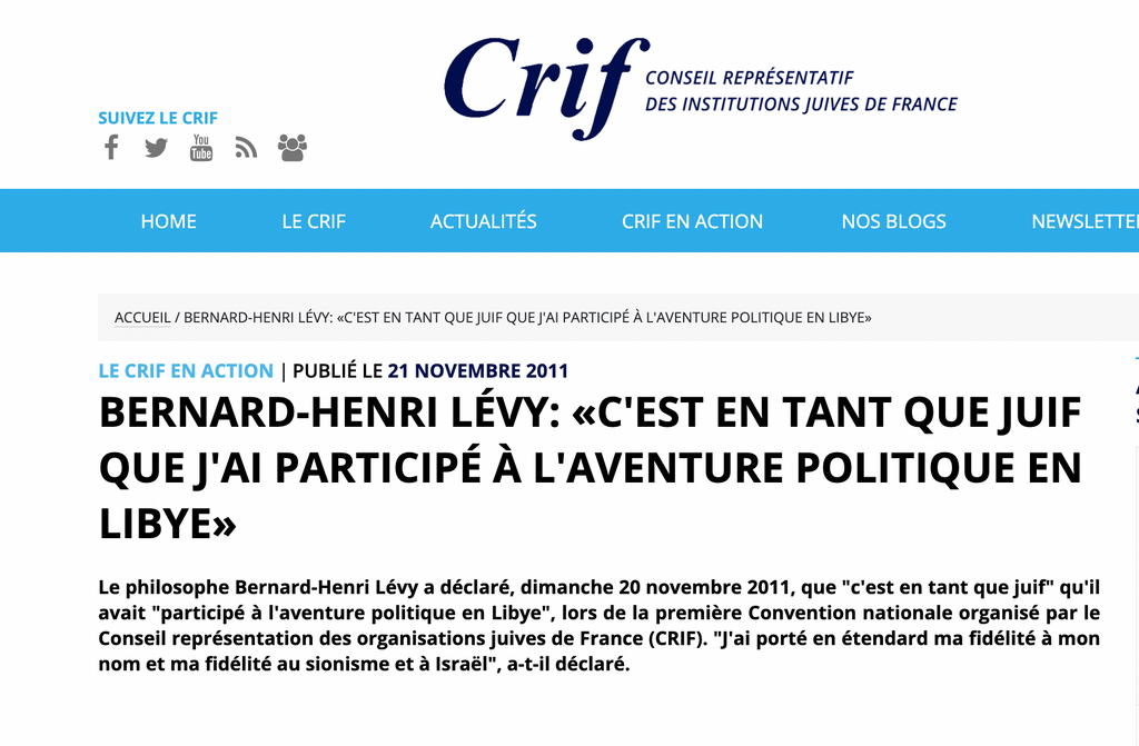 Bernard Henry-Levy: "C'est en tant que juif que j'ai bombardé la Libye avec l'argent des goyim participé à l'aventure politique en Libye"
