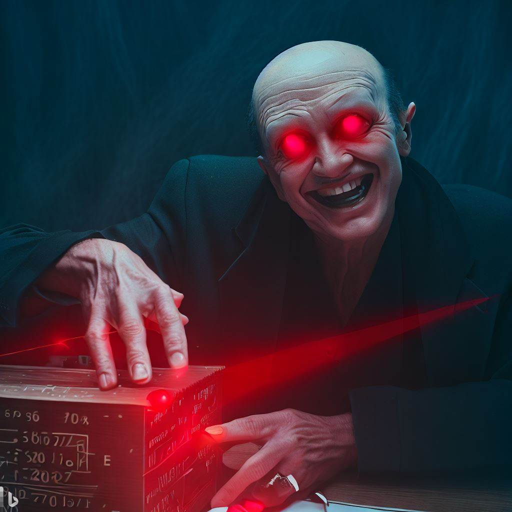 Malefic Klaus Schwab with red laser eyes and smiling while putting is hand on the mathematic box