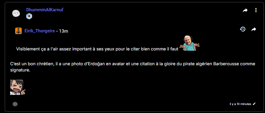 C’est un bon chrétien, il a une photo d’Erdoğan en avatar et une citation à la gloire du pirate algérien Barberousse comme signature.