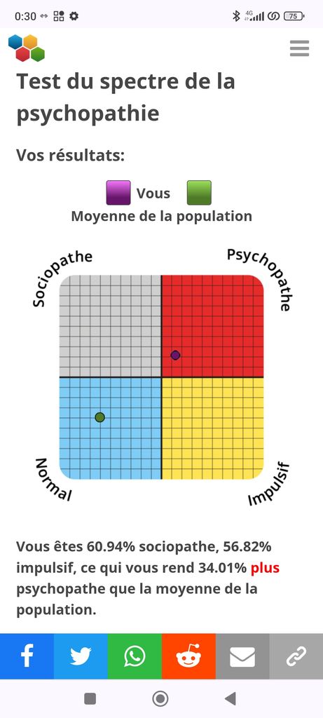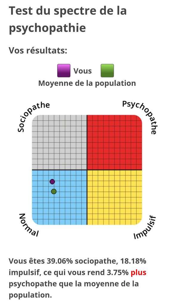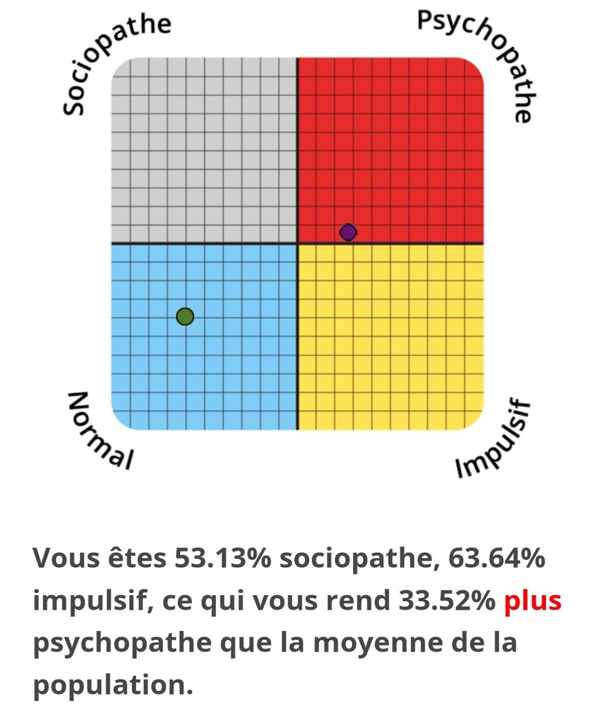 Vous êtes 67.19% sociopathe, 75% impulsif, ce qui vous rend 46.23% plus psychopathe que la moyenne de la population.