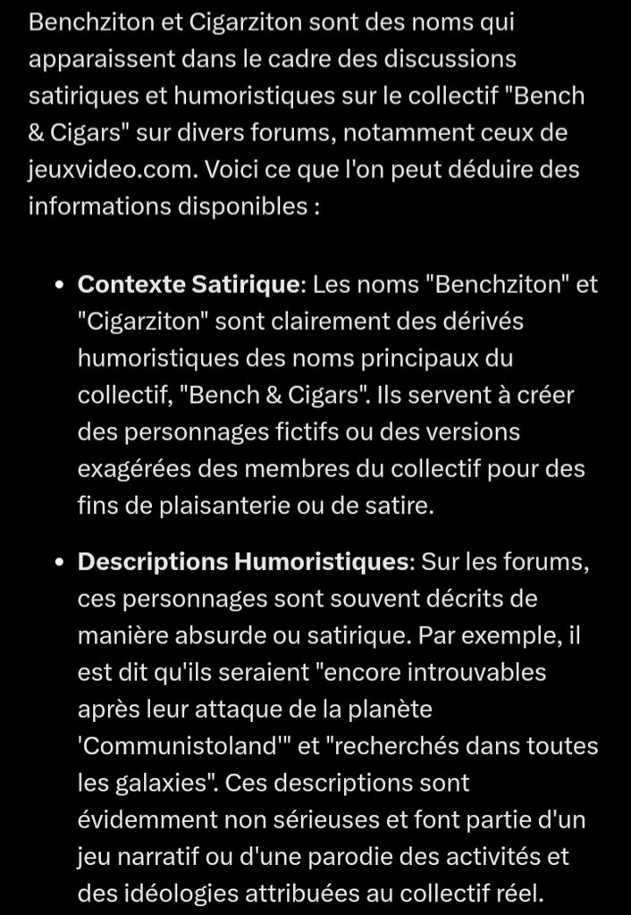 L'IA Grok au courant du collectif Bench & Cigars.