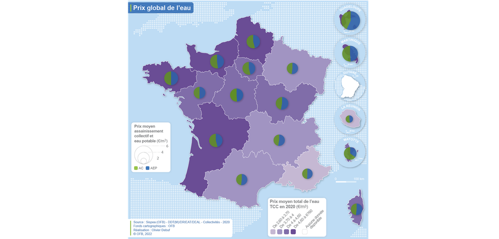 - Elle indique le prix de l'eau en m3 dans les différentes régions en France