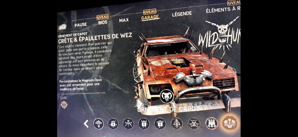 T'as du ramasser les ornements de capot du film Mad Max 2. Le casque du pilote d'hélico et les épaulettes et l'iroquois rouge du méchant punk.