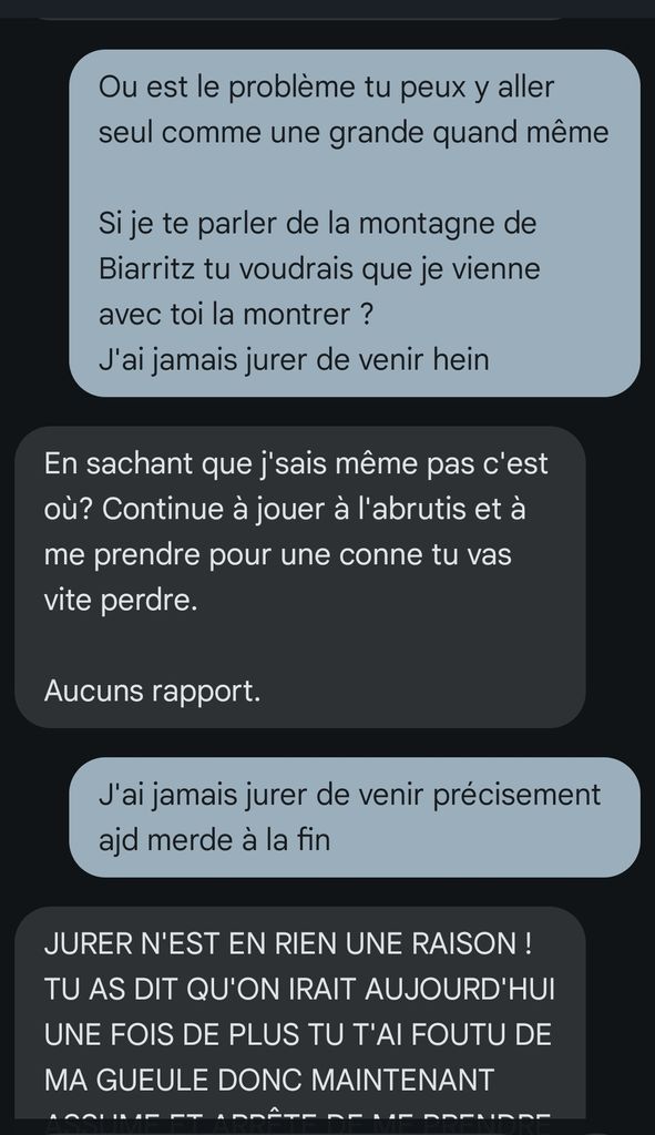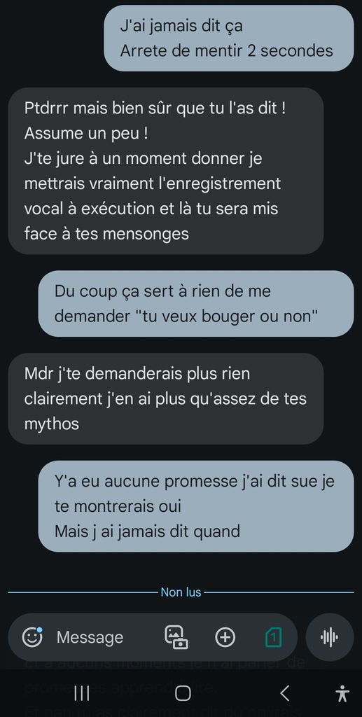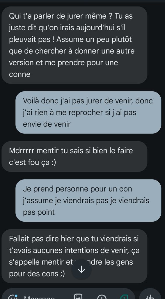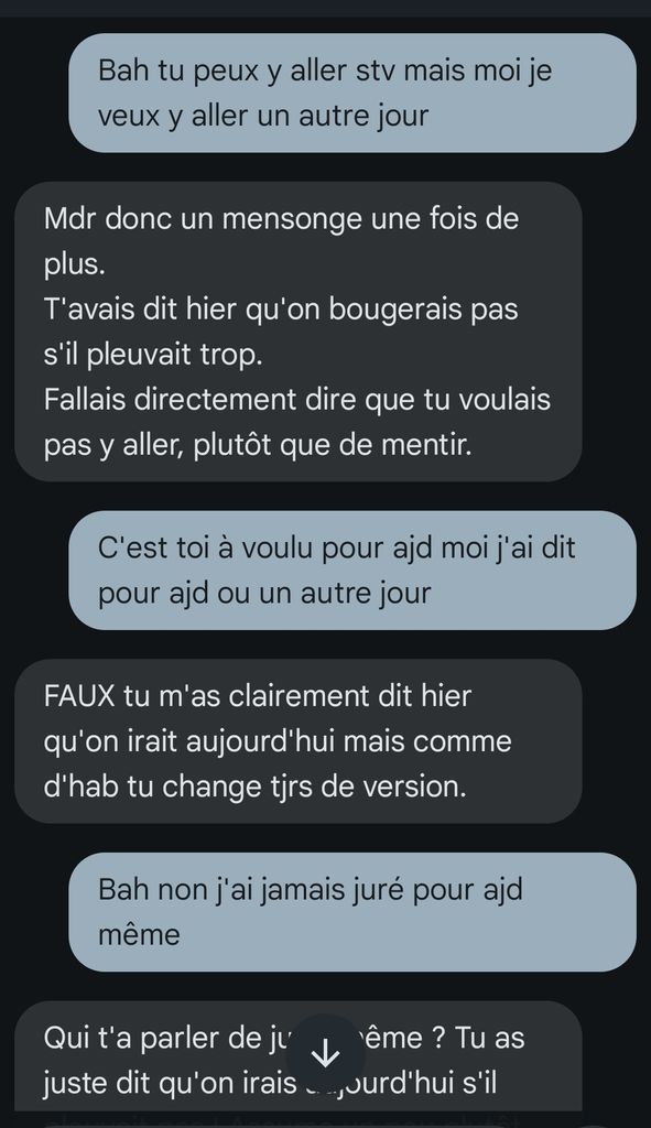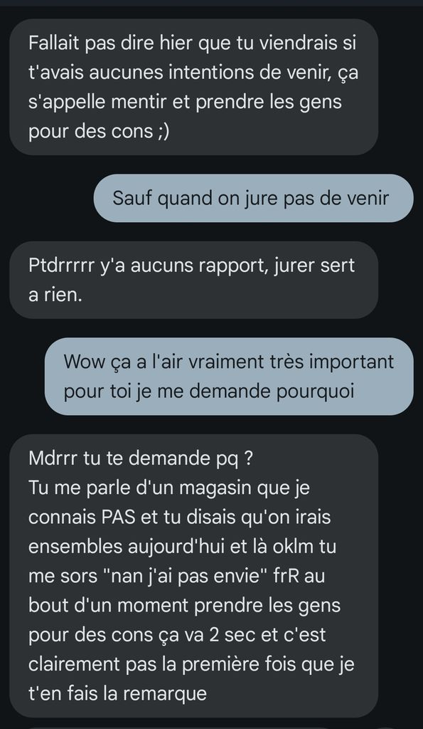 Bah ouais mais elle m'a répondu et inventant que j'ai promis ou je sais pas quoi