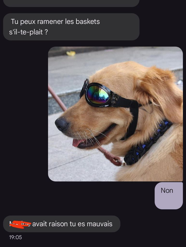 Et en plus elle ose me demander une vieille pairs de baskets de son pote qui as vomi sur MES BASKETS